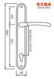 Дверна ручка на загальній планці SIBA сумісна з будь-якими стандартними замками 55, 62, 72, 85 або 92 мм. (Відстань між центром ручки та циліндра). Комплектується стяжними гвинтами.